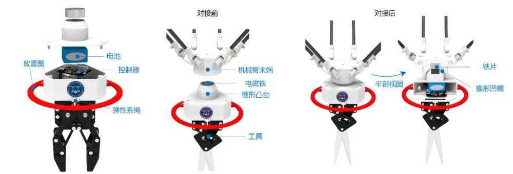 柔性电磁对接机构。这是一个在接触时会自动“吸附”的电磁智能接口,大大提升了对接的精准度。在操作无人机的机械臂末端,设计了一个内部带着铁片的空腔装置;工具箱无人机的上侧,有四个环形的柔顺圆锥电磁对接装置,它们下方都可以按需装配不同的操作工具(如剪刀、爪子等),顶部则是带有电磁铁的锥体(见图4)。