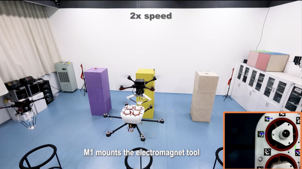 北京时间9月24日晚23时,Nature报道了西湖大学工学院赵世钰实验室在该领域实现的突破,他们研发了名为FlyingToolbox(飞行工具箱)的空中协同操作系统,在国际上首次完成了多架旋翼无人机的空中工具交换,实现了“叠式”飞行状态下的高精度协同作业,成功解决了近距离飞行与高精度操作不可兼得的关键技术难题。