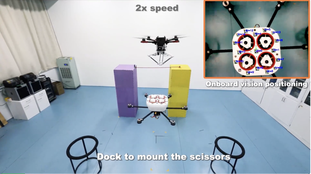 FlyingToolbox实现了“双机协作”,成功完成空中剪彩、抓取、放置等一系列动作。整个流程全部基于机载算法自主完成。
