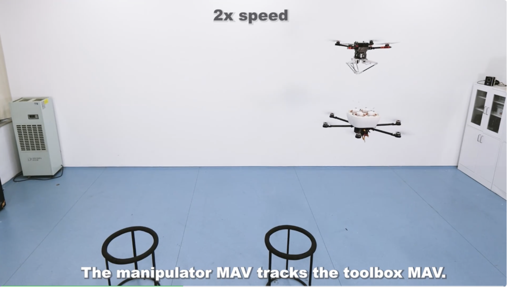 FlyingToolbox还具有“运动中对接”的能力。在之前的实验中,下方的工具箱无人机始终保持悬停状态,现在,工具箱无人机动了起来,上方的操作无人机,依然能够顺利完成工具的抓取。这个更加具有挑战性的场景,拓展了这套系统的应用范围。