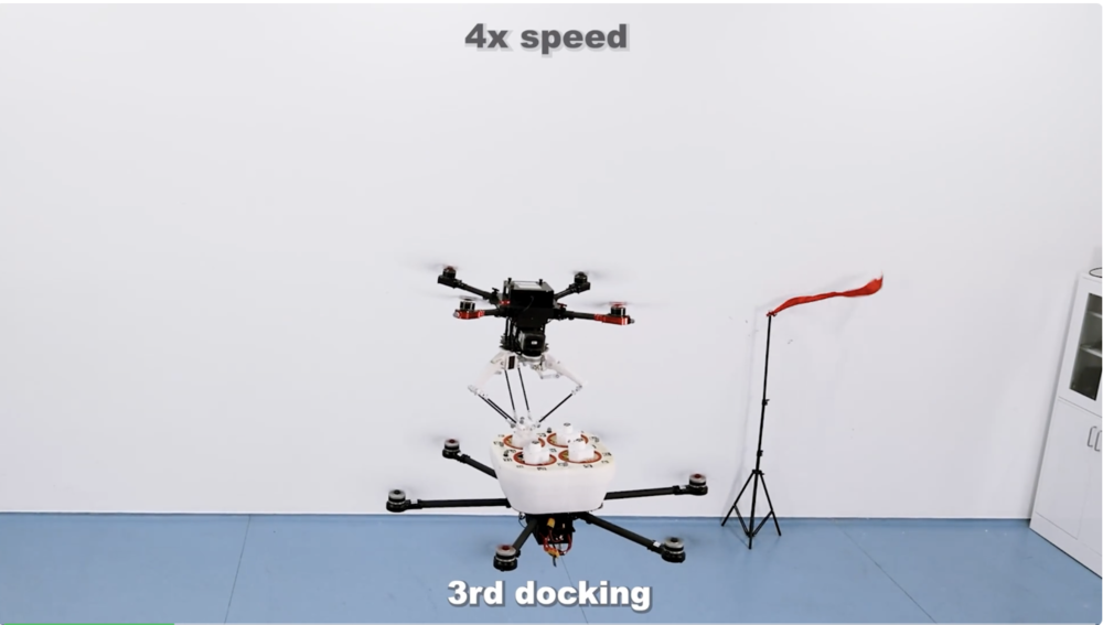当工具箱无人机收到操作无人机发出的对接信号,它顶部的电磁芯片就会通电、产生磁力,就能与后者的锥形凹槽借由磁力吸附;并且,由于柔顺圆锥电磁对接装置是用数条橡胶材质的弹性系绳连接着安装环,装在工具箱无人机顶部的,具有“弹性”(即柔顺性,可想像为一个迷你的蹦床),即便两台无人机接上时有稍许的姿态偏移,也能保证对接成功。