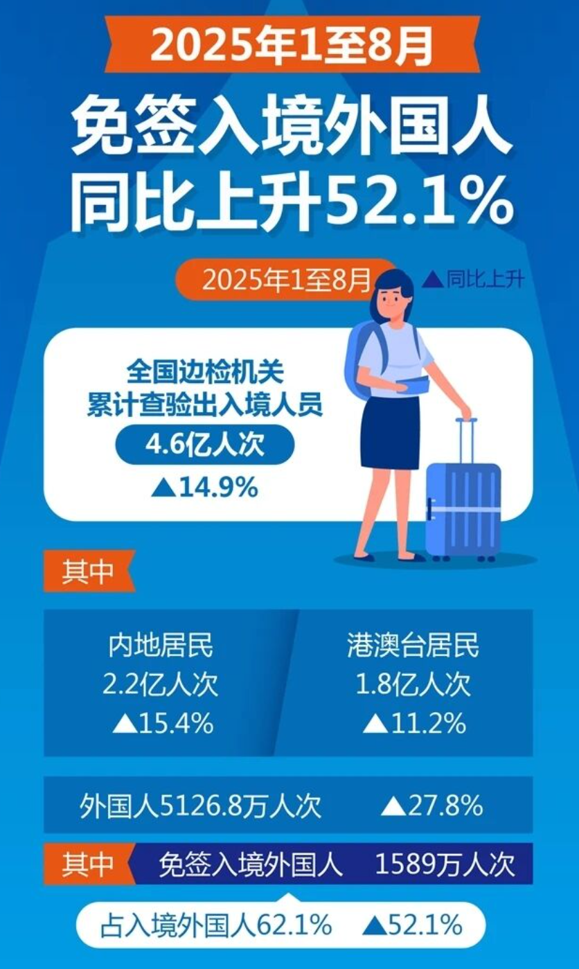 旅界此前曾写过,今年上半年1~6月,2000万人次外国人涌入中国,而据国家移民管理局最新数据,1~8月,外国人来华人次已经升至2500万,中国文旅市场红利正在逐步显现。