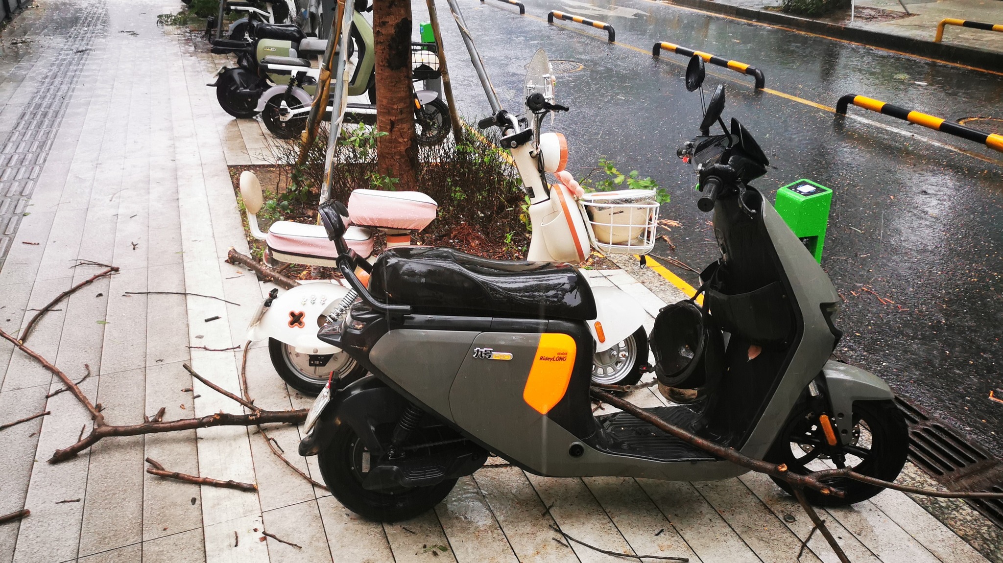 ● 台风过后,掉落的树枝和被压倒的单车。拍摄:李丹