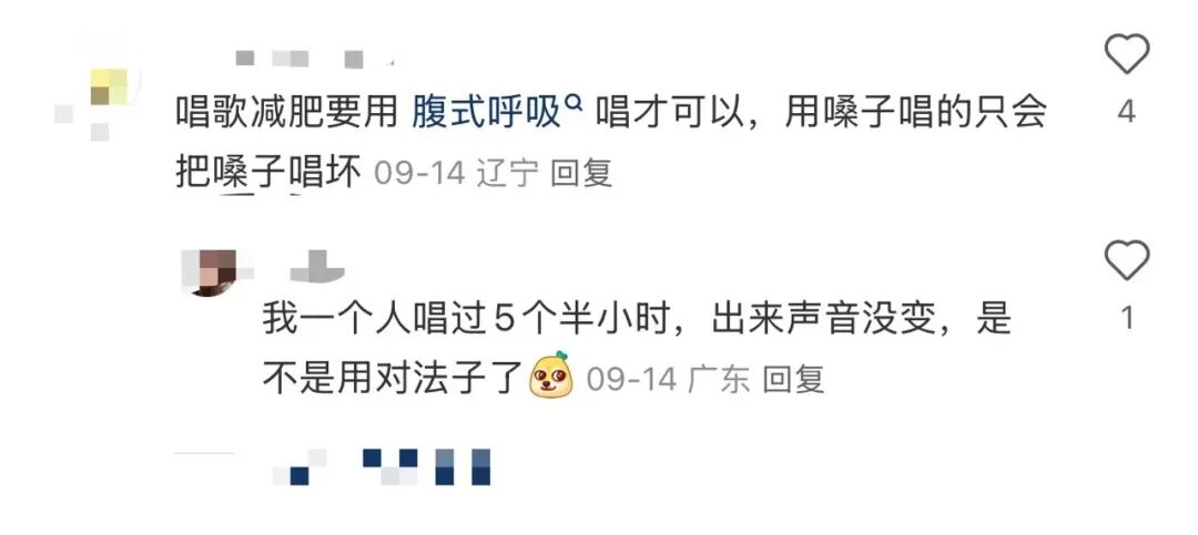 歌单也很重要,“唱流行歌和民歌减肥效果一般,真正能瘦的是DJ、摇滚或者美声。要用丹田唱,而不是嗓子硬扯。”