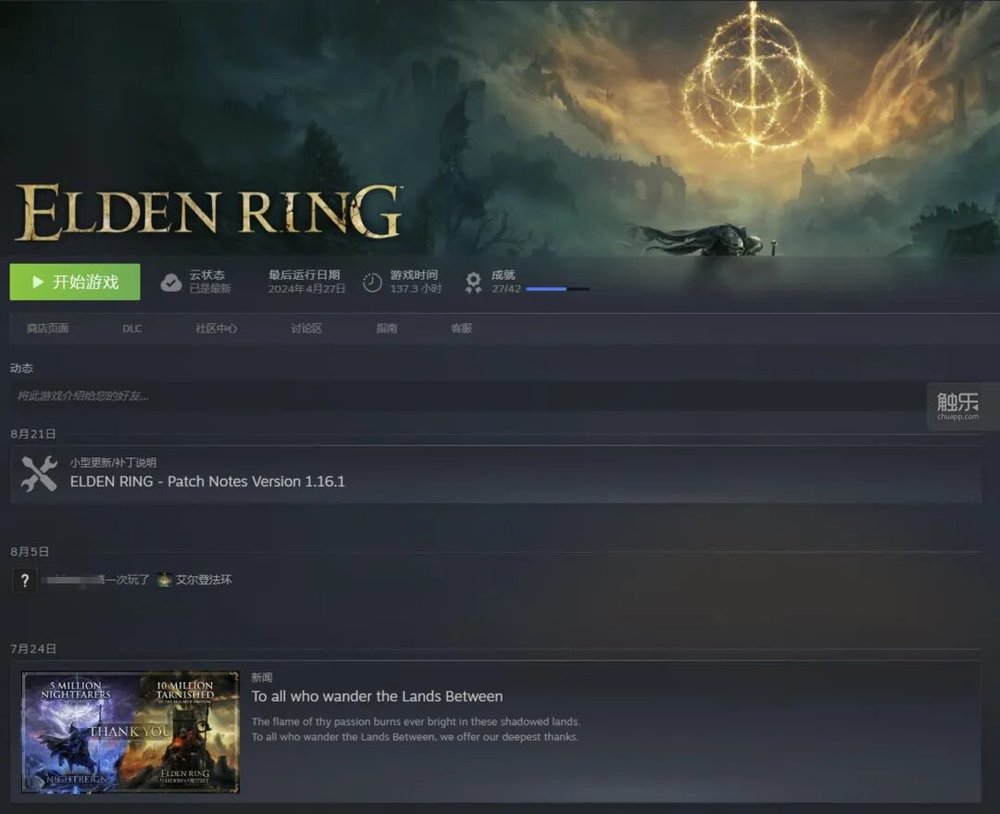 老马最后一次启动艾尔登法环是在2024年4月27日
