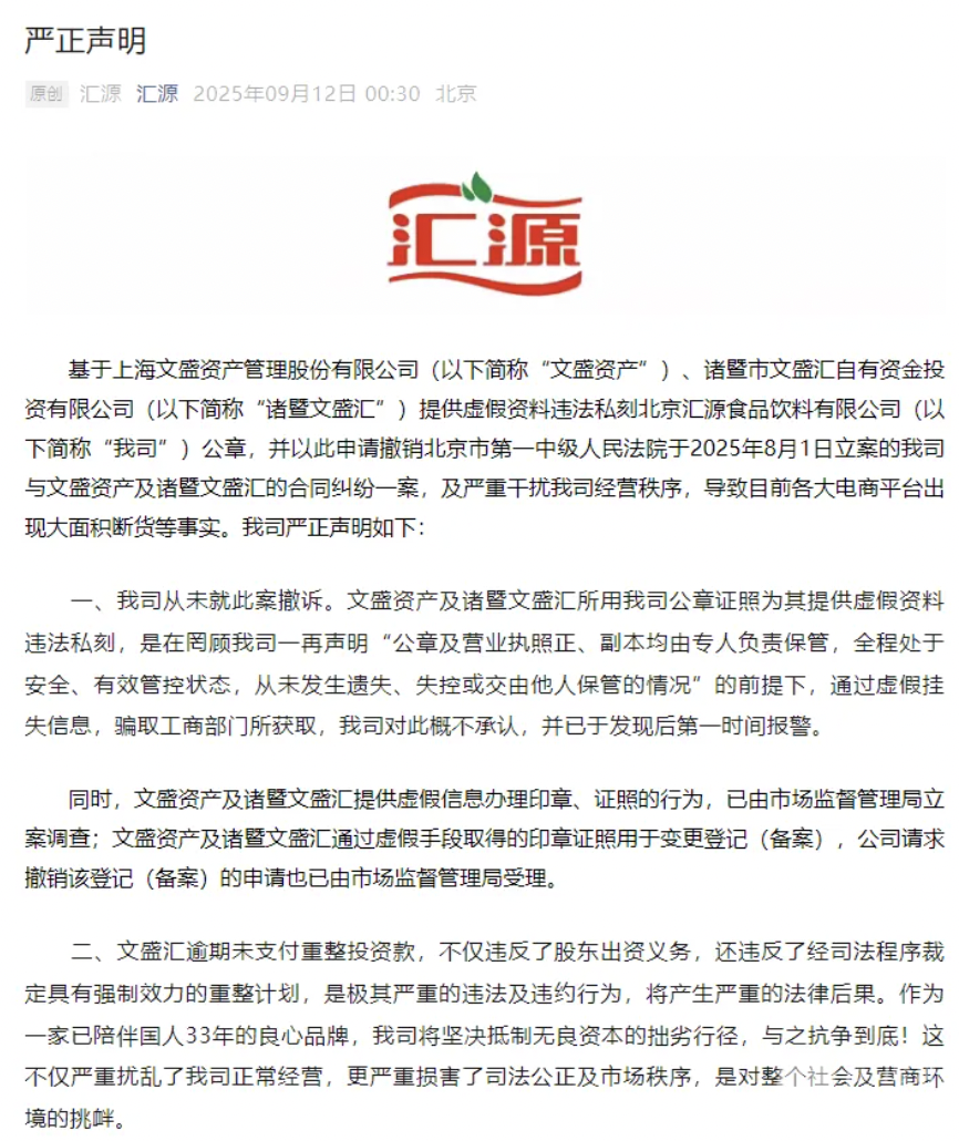 9月,北京汇源食品饮料有限公司(以下简称北京汇源)公众号发出声明,称上海文盛资产管理股份有限公司(北京汇源重整投资人,下简称文盛资产)、诸暨市文盛汇自有资金投资有限公司(文盛资产参与北京汇源重整而设立的持股平台公司,下简称诸暨文盛汇)未支付重整投资款、私刻公司公章,严重扰乱公司经营秩序,导致各大电商出现断货情况。