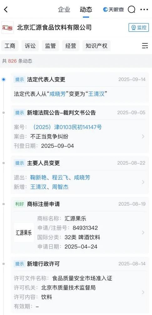北京汇源近期的工商信息变更 图片来源:天眼查App截图