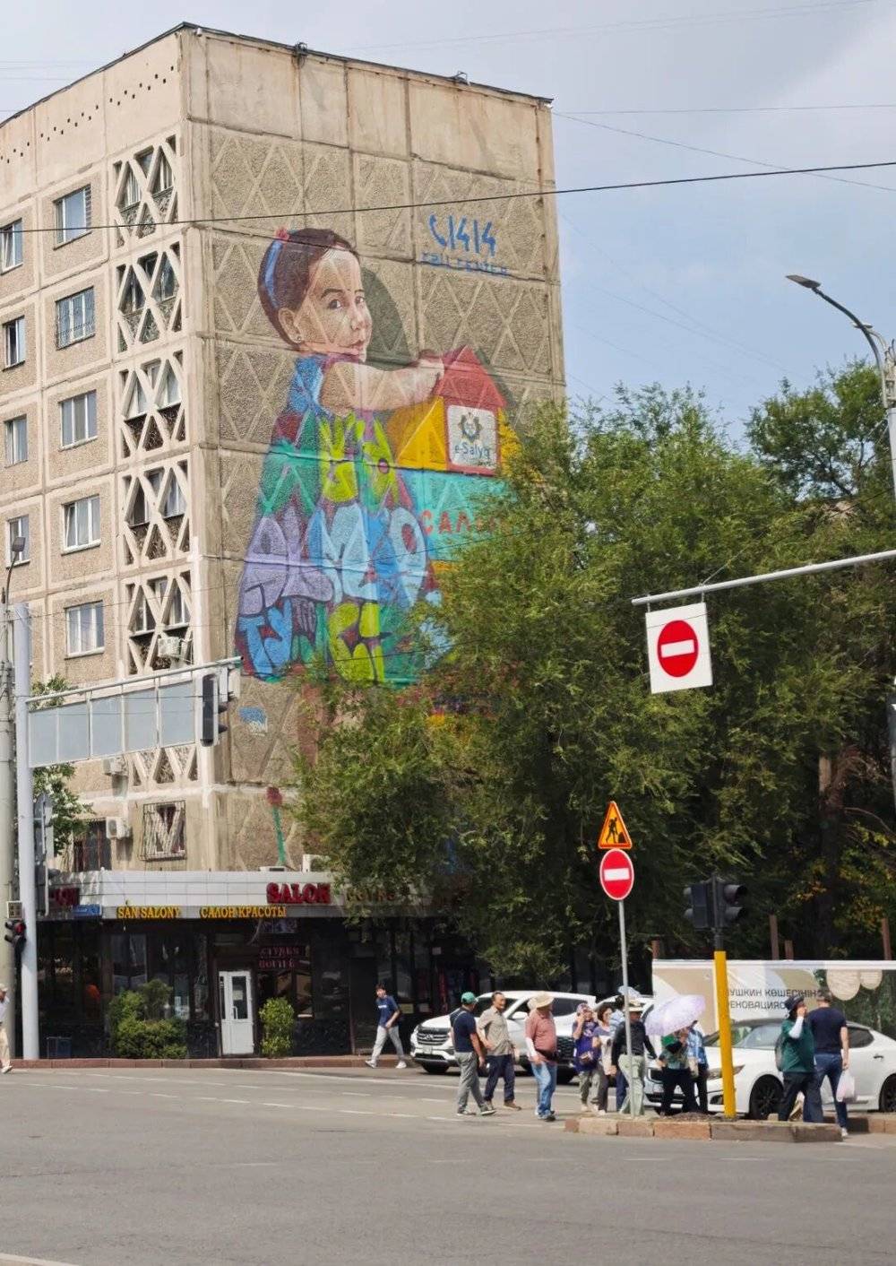 这是阿拉木图一幢代表性的苏联老建筑和现代壁画