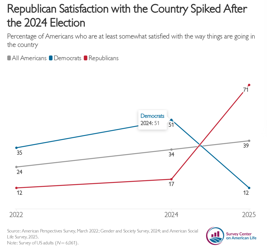图1:共和党人在2024年大选后对国家现状的满意度大幅提升(对国家发展至少感到有些满意的美国民众比例)