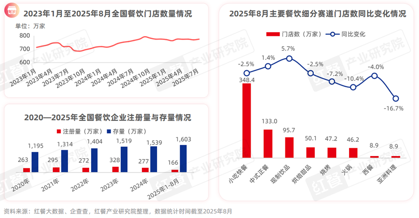 红餐大数据显示,截至2025年8月,全国餐饮门店数量超过760万家,较2024年同期降低了1.9%。从具体赛道来看,截至2025年8月,现制饮品和中式正餐的门店数量较2024年同期有所增加,其中现制饮品的门店数同比增幅达到5.7%;小吃快餐、烘焙甜品、烧烤、火锅、西餐、亚洲料理的门店数较2024年同期有所下降。