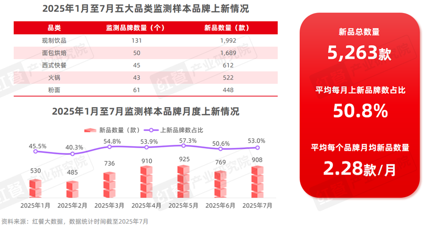 为了在激烈的市场竞争中保持品牌竞争力,众多餐饮品牌纷纷加快了产品上新步伐。据红餐大数据,2025年1月至7月,红餐产业研究院监测的五大品类330个样本品牌共推出了5,263款新品,平均每个品牌月均上新2.28款。