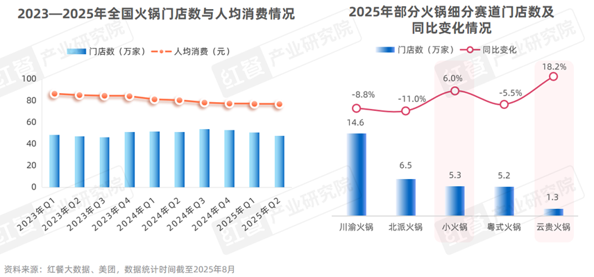 与此同时,在性价比消费需求增长的趋势下,火锅人均消费持续下滑。红餐大数据显示,截至2025年8月,全国火锅门店人均消费已降至76.7元,较2023年第一季度(86.5元)下降了11.3%。