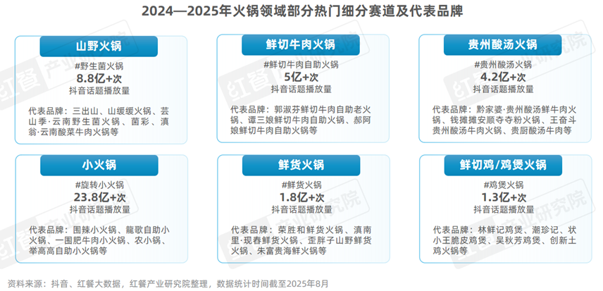 其中,小火锅和山野火锅的表现较为亮眼,截至2025年8月,抖音平台上“旋转小火锅”“野生菌火锅”话题的视频播放量分别超过了23.8亿次和8.8亿次。