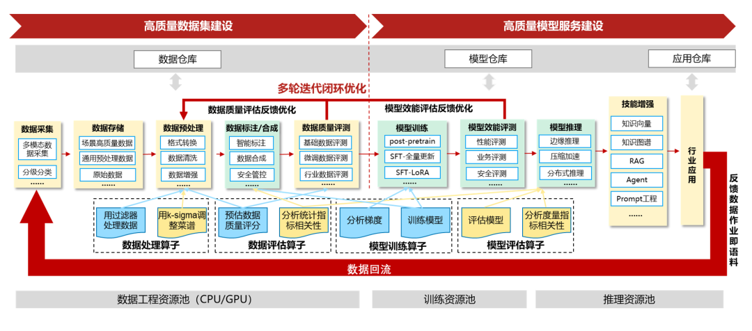 整个过程,从杂乱无章的原始数据,到标准化的、高质量的数据集,到能解决实际问题AI模型服务,再到数据回流、模型自优化,形成了一个完整高效、自动化、自闭环的流水线。