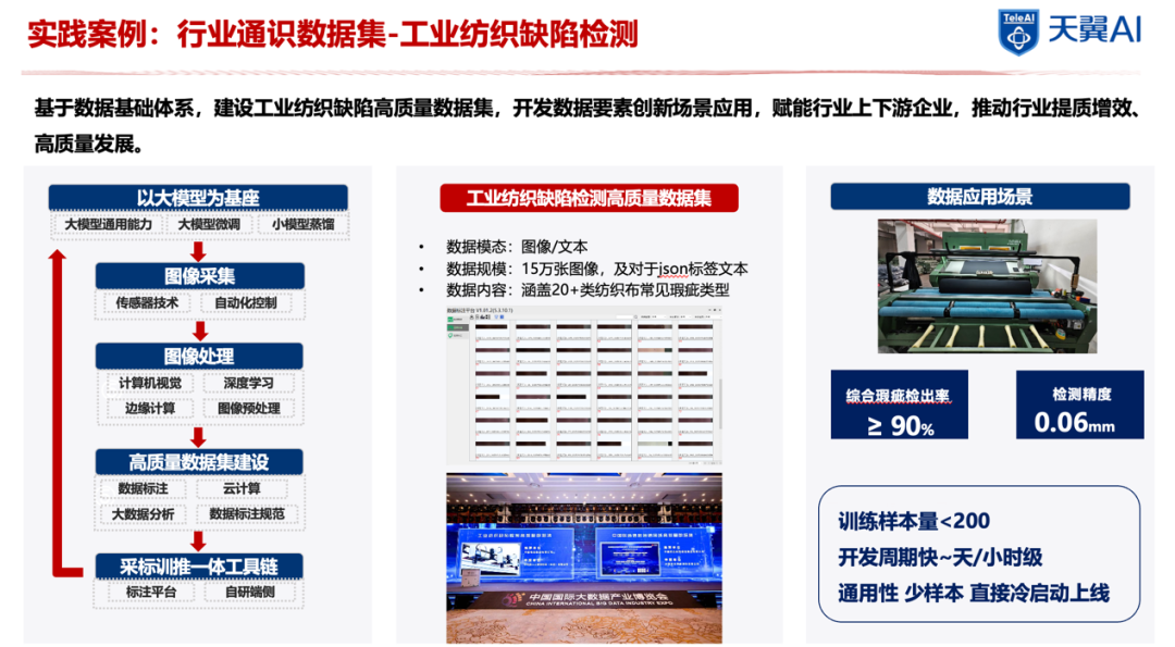 我们通过采集、清洗、标注15余万张图像,构建了这样一个高质量数据集。用它训练出的行业模型,能够自动识别出布匹上毫米级的瑕疵,综合检出率超过90%,并且能实时将瑕疵的类型、数量、位置传输给生产系统,代替了人工。对企业来说,这就是实实在在的降本增效,这个能解决实际问题的数据集,就是高质量的。