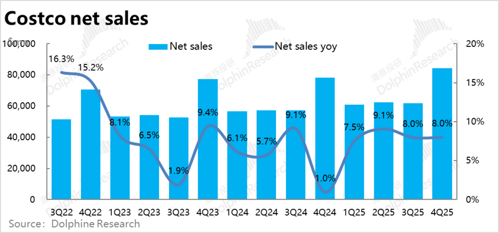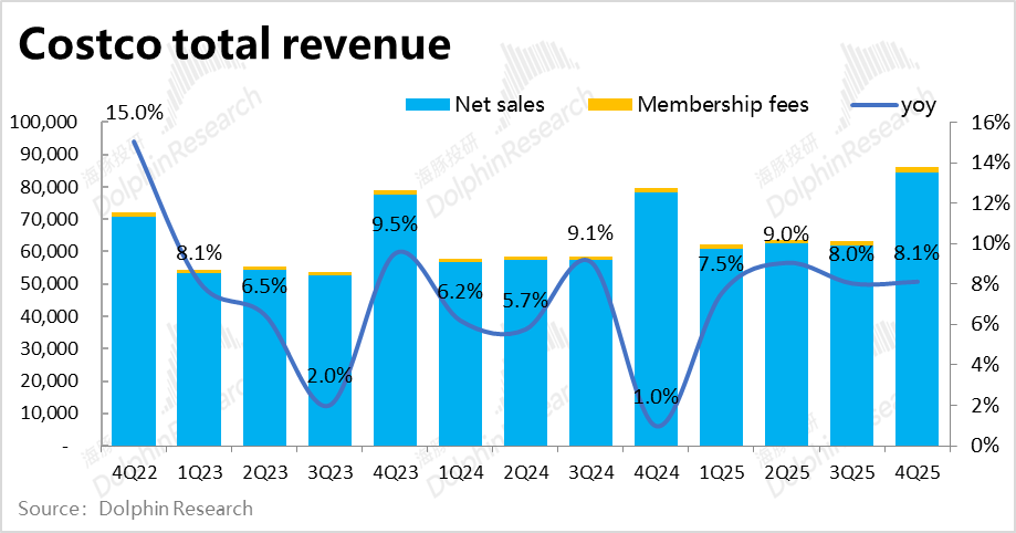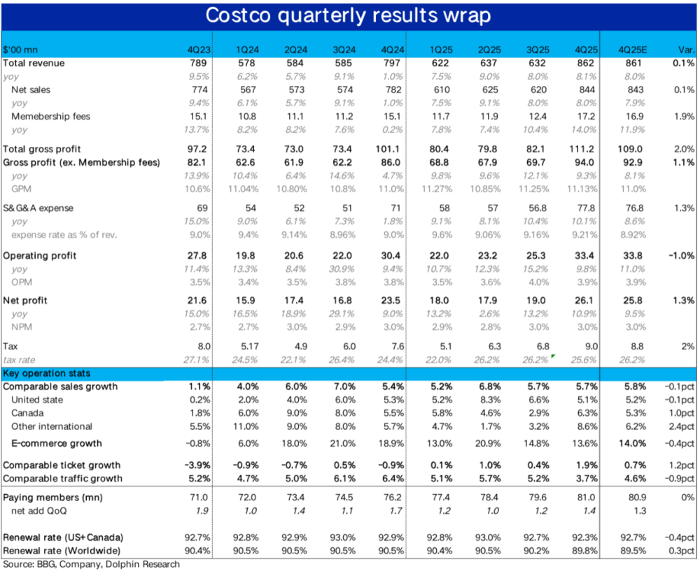 财务指标上,本季Costco实现总收入$862亿,同比增长8.1%,表现平稳且符合预期。