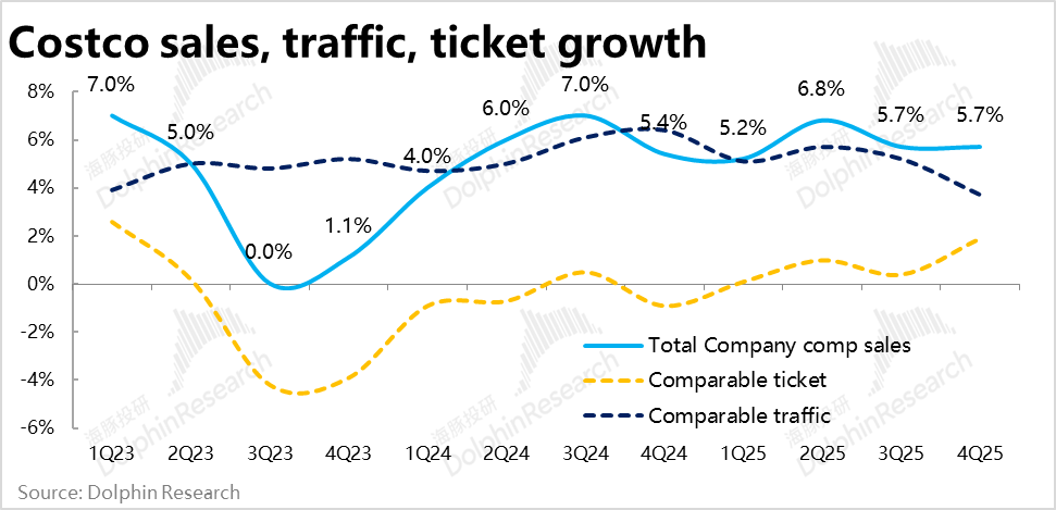1、名义同店增长看似平稳,但客流已明显走弱:最关键的经营指标,Costco本季度整体同店销售增速为5.7%,相比上季持平,看起来依旧平稳。但同店客流量的增长已明显下滑到仅3.7%,是近3年来的最低水平。
