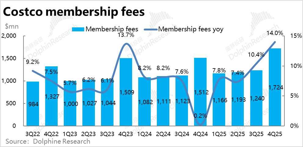 整体上,如上文所述,虽然更“真实”的同店销售在走弱,但名义上的同店增长依然平稳。并且本季度内新增了9家门店,开店节奏依旧较快,对收入增长有拉动作用,因此本季度Costco整体商品销售收入仍同比增长了8%,和上季持平。