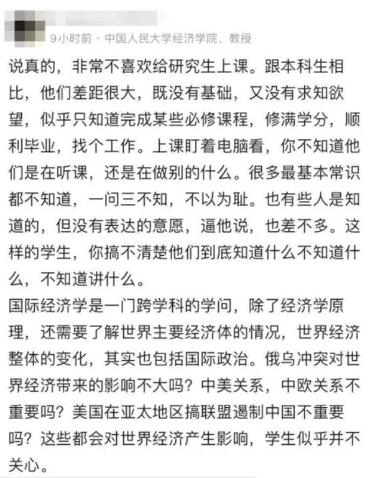 不仅是用人单位,就连老师都开始“歧视”研究生了。几年前就有中国人民大学某教授发文,表示非常不喜欢给研究生上课,而给出的理由是,跟本科生相比,他们差距很大,既没有基础又没有求知欲,很多最基本的常识,一问三不知,不以为耻,只知道完成必修课程,修满学分,顺利毕业。