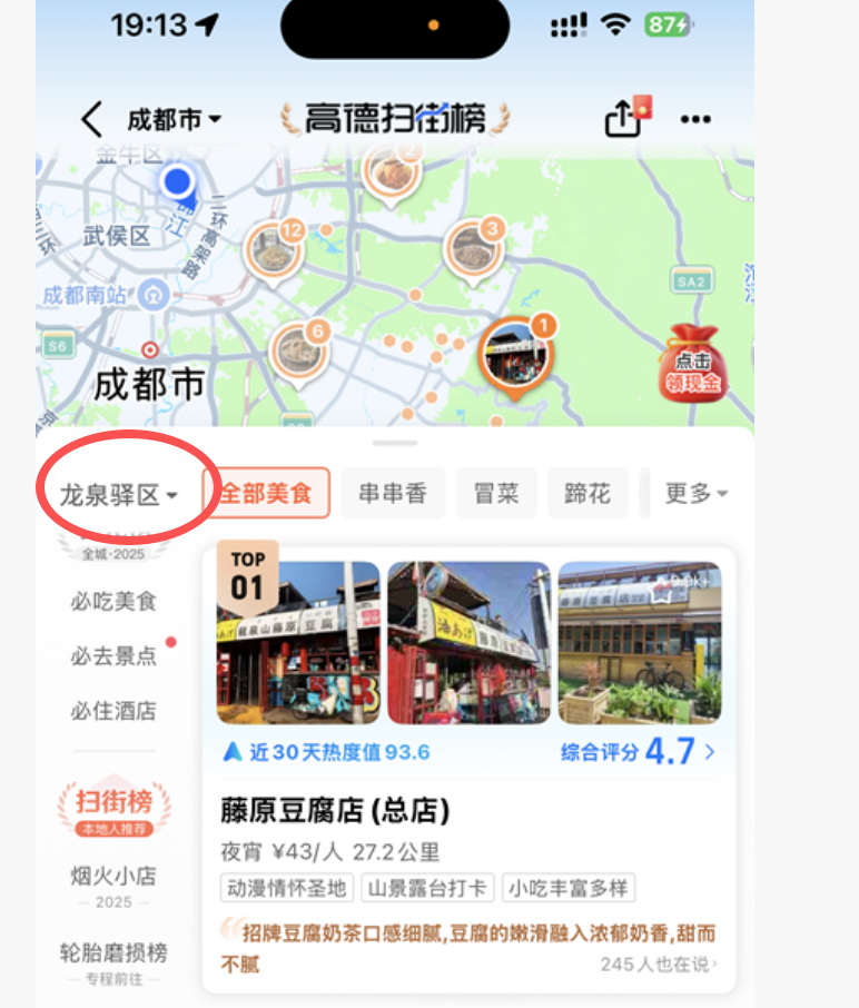 但似乎高德扫街榜有时候又不够聪明。我在我自己的另外一篇文章《高德地图:你用AI骗了我两次》里面说了,高德扫街榜把“藤原豆腐店”作为成都美食第三名推荐。