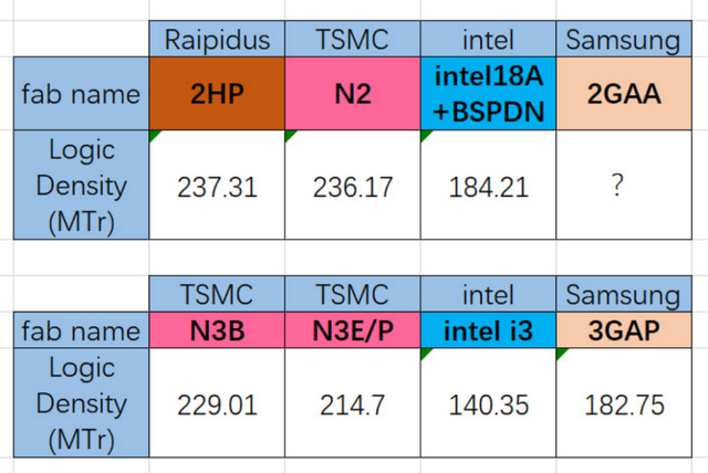 根据日本芯片制造商Rapidus分享的其2nm尖端节点2HP的数据,进行拟合计算后得出Rapidus 2HP工艺逻辑密度可达237.31MTr/mm2,与台积电同代制程N2的236.17 MTr/mm2十分接近。