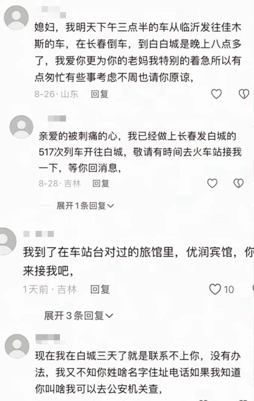 先是一个山东临沂大爷只身一人坐火车抵达吉林白城,在火车站对面的“优润宾馆”苦等3天,始终没见到想见的人;再是一位黑龙江九旬老人,任凭家人怎么阻拦,都执意要前往白城寻觅心上人。与此同时,还有不少大爷大叔大哥正在奔赴白城的路上。
