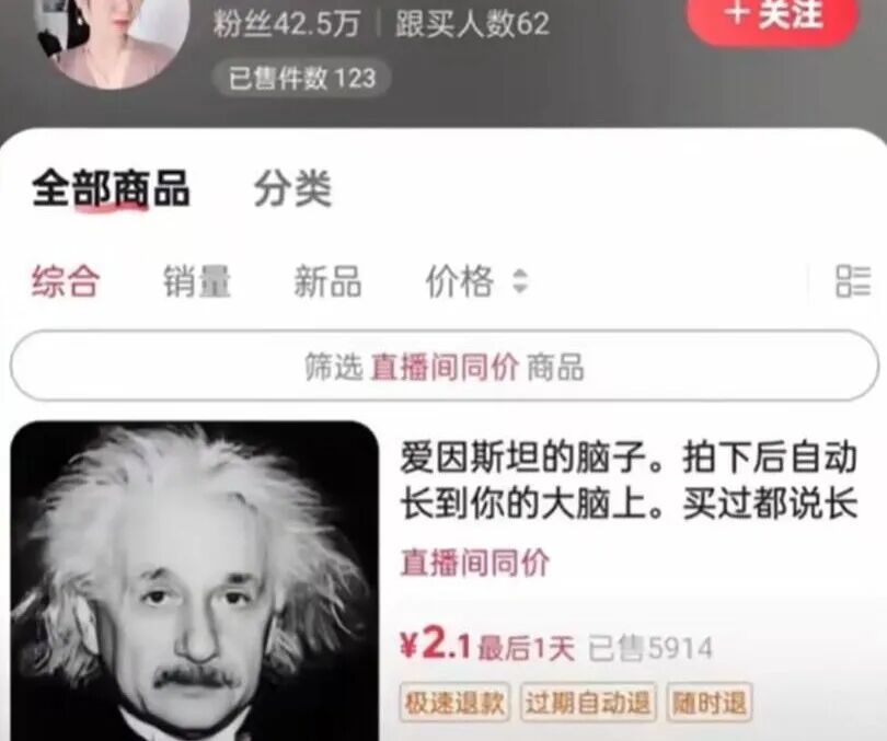 很快就在账号橱窗里挂上了一些小商品,比如售价两块一的爱因斯坦的脑子。