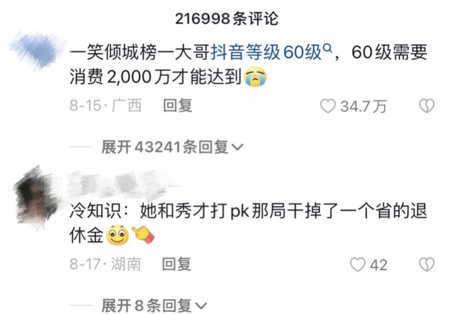 还有网友称,一笑倾城的榜一大哥疑似为她消费了2000万。