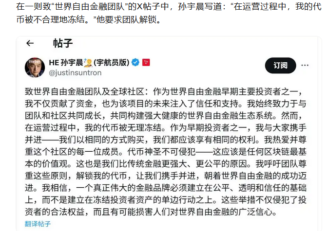 不得不说,孙宇晨充分展现了一种异化后的“全球公民”素养,在中国则中国,在美国则按美国人方式办事。当然,即便是这种高层的政治押注也并非毫无风险。前不久特朗普家族的WLFI项目以“可疑活动”为由,冻结了孙宇晨的代币。毕竟对特朗普而言,孙宇晨充其量只是向自己示好的芸芸众生一员,这并不足以让孙宇晨成为对自己有价值的盟友。