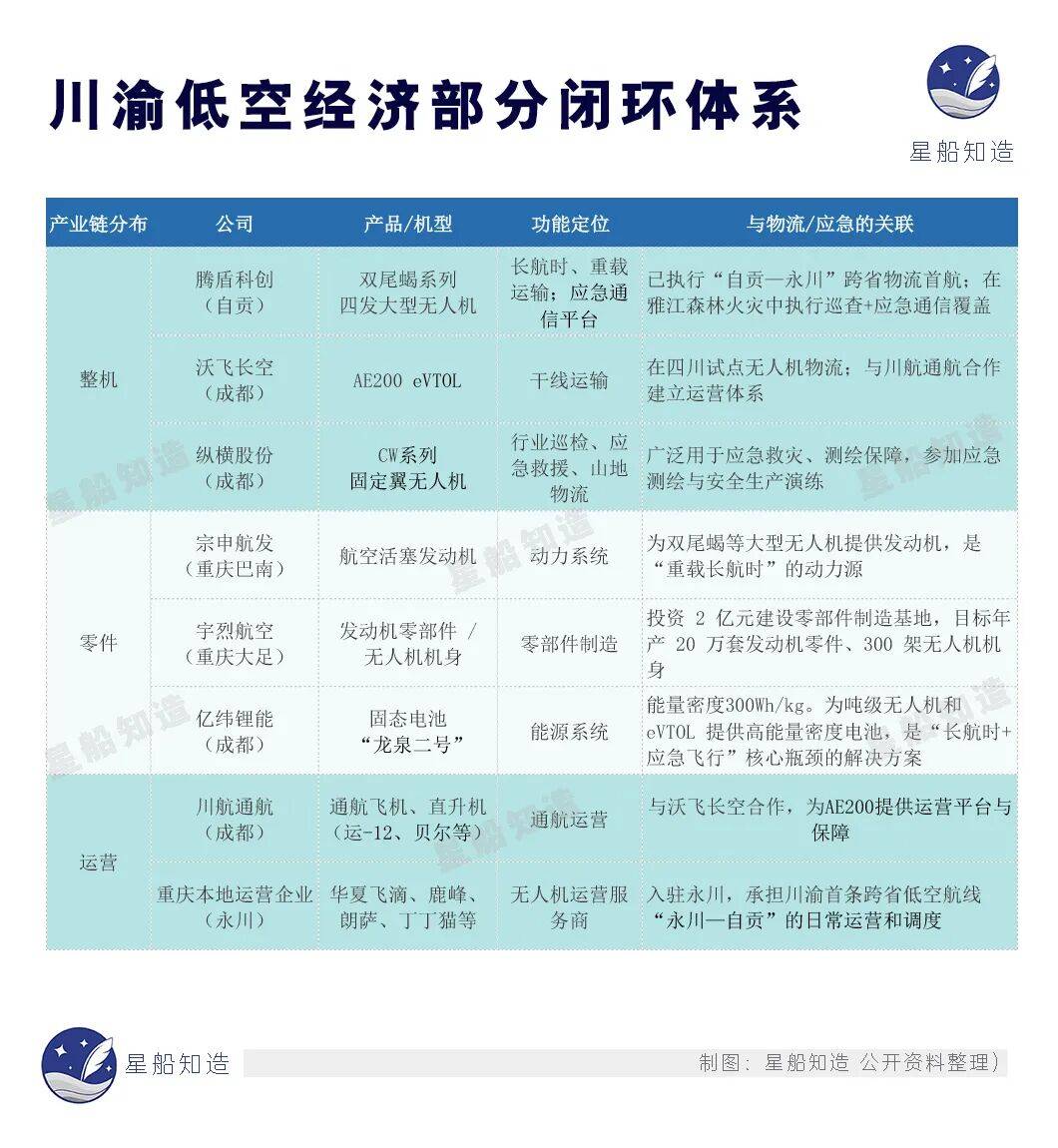 如果说“六区试点”是地理维度的功能分工,那么在企业层面,川渝的产业链也逐渐清晰:从整机、零部件、动力能源到运营服务,形成了一个以物流与应急为核心的闭环体系。