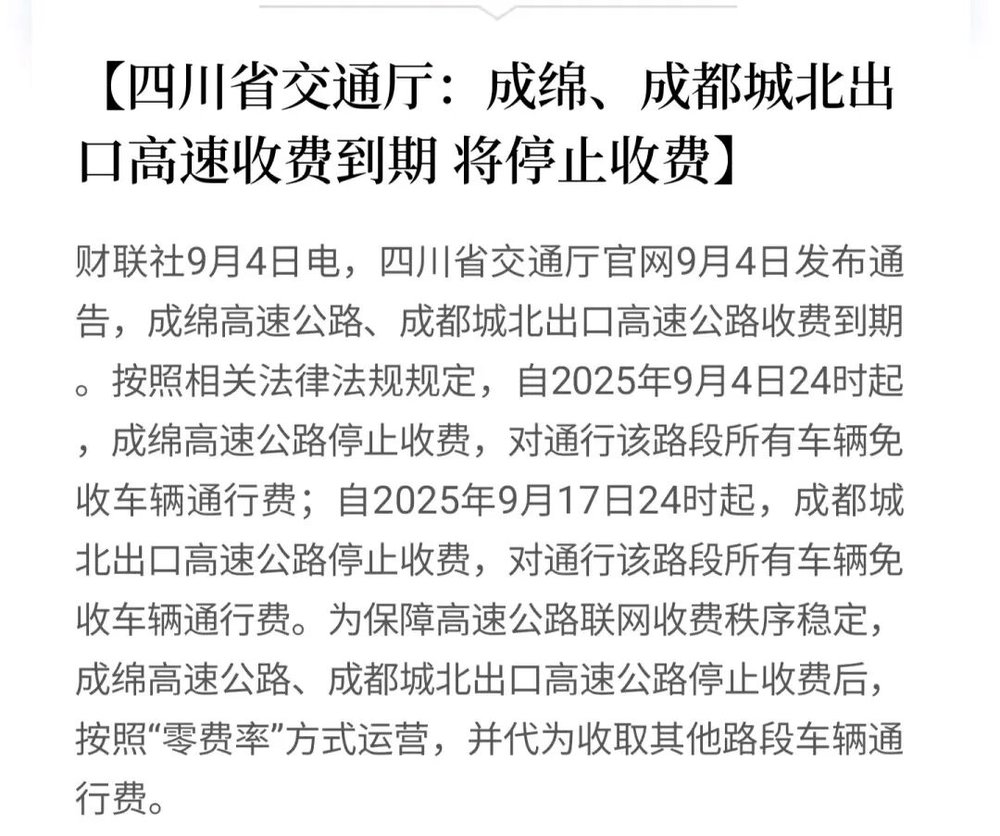 然而不久前,四川有关部门发布公告,成绵高速、成都城北出口高速即将先后停止收费,成为西部地区率先取消收费的高速公路。