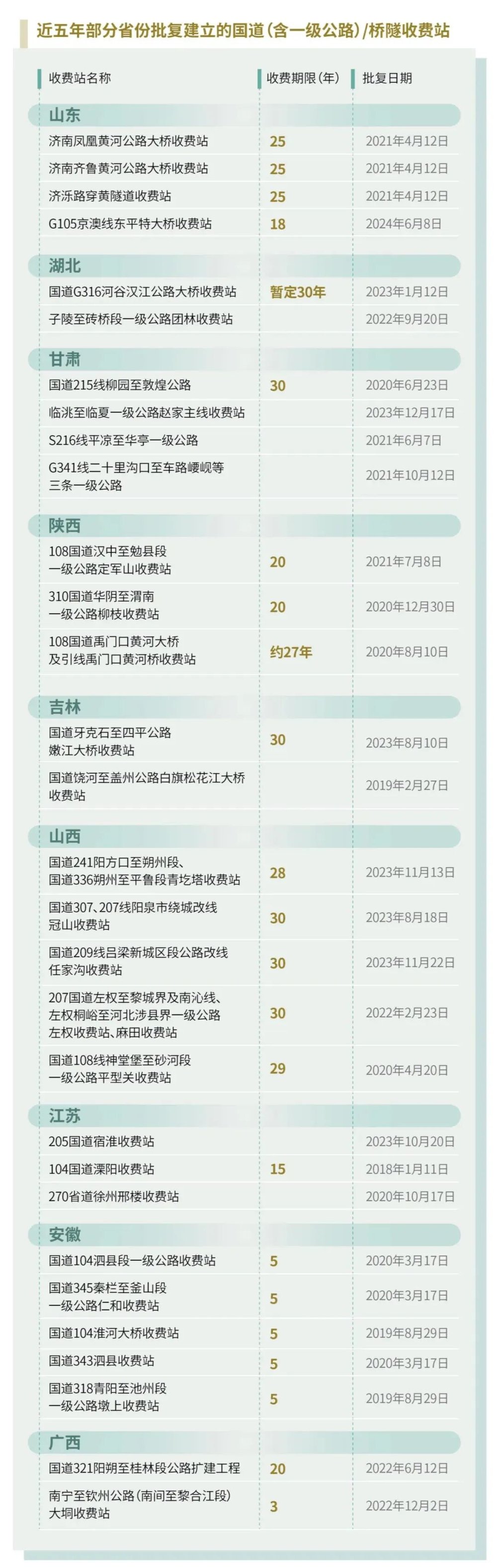 据统计,近年来全国至少建了30处国道、一级公路、桥隧等收费站,收费年限少则三五年,多则三十年。