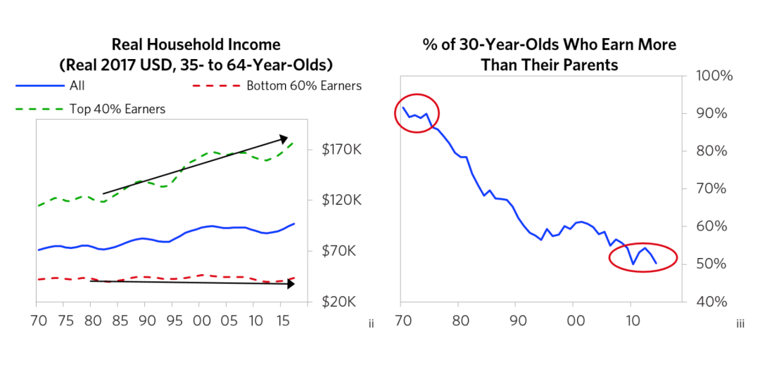 右图表明,子女成年后收入超过父母的比例从 1970 年的 90%降至如今的 50%。