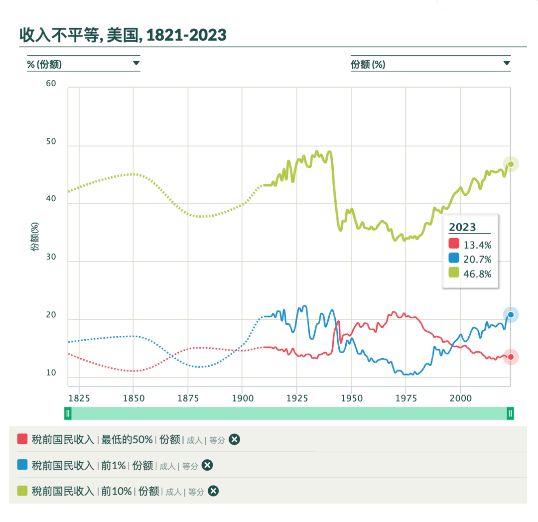 与此同时,收入前 10%群体的收入翻了一番,而顶层 1%群体的收入更是增长了两倍。