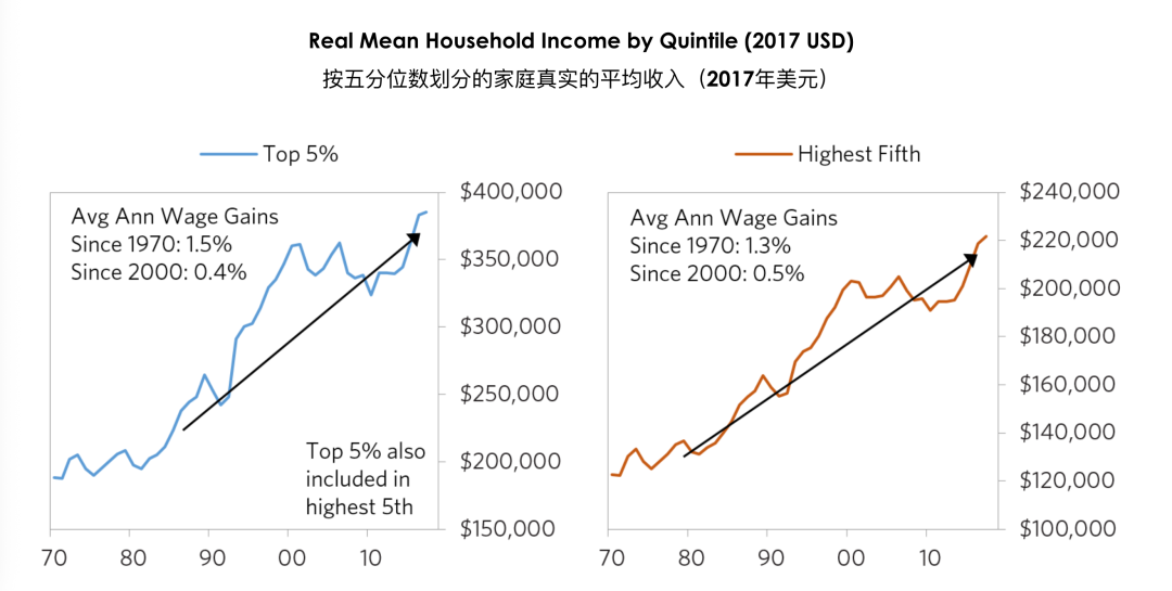 下图显示了自1970年以来总人口按五分位数分列的真实的收入增长情况,看看你自己你在哪一层?我的目标是向你展示更广阔的视野。