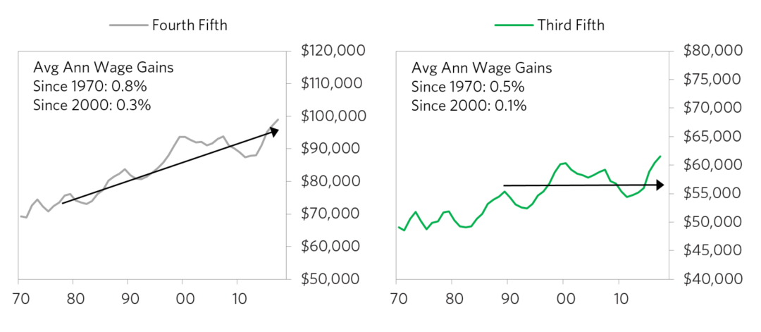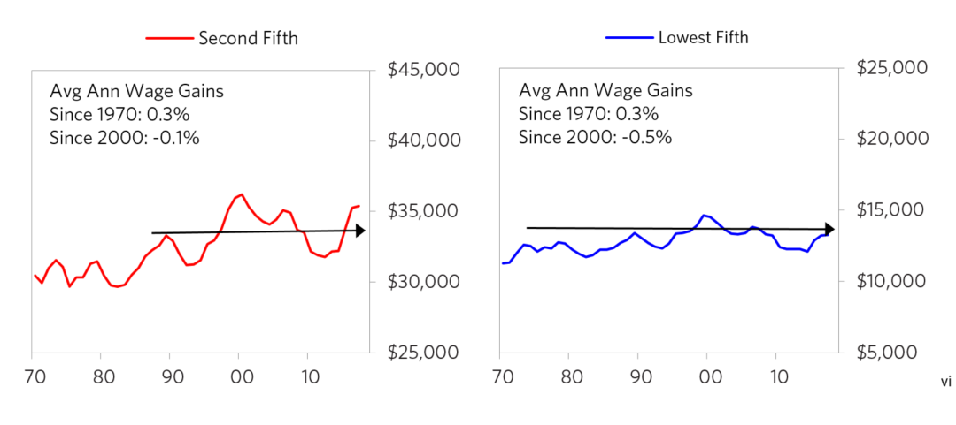 左图显示,1980 年以来,处于收入底层 60%的壮年劳动者实际收入(经通胀调整后)毫无增长。