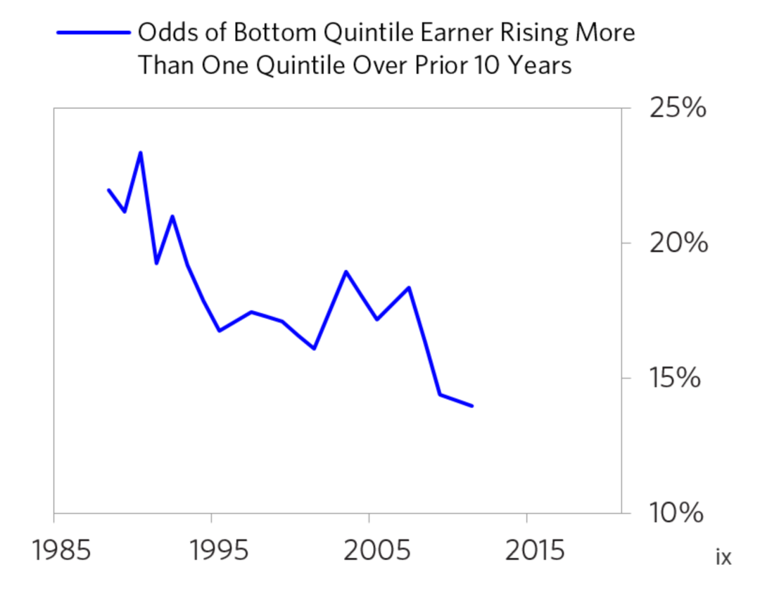 他们越来越陷入贫困。下面的图表显示了在10年内,底层五分之一的人上升到中间五分之一或更高的概率,这种可能性从1990年的23%下降到2011年的14%。