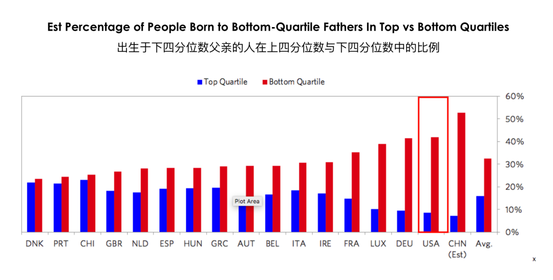 如下图所示,在美国,父亲收入处于最低四分之一的人有40%的机会留在该四分之一,只有8%的机会进入最高四分之一,这是平均上升概率的一半,也是分析的国家中最差的概率之一。