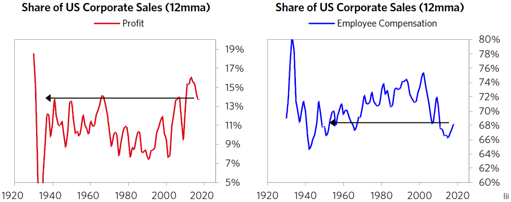 由于这两种力量的作用,相对于工人的收入份额,用于利润的收入份额增加了。下面的图表显示了自1929年以来企业收入中用于利润的百分比和用于员工薪酬的百分比。