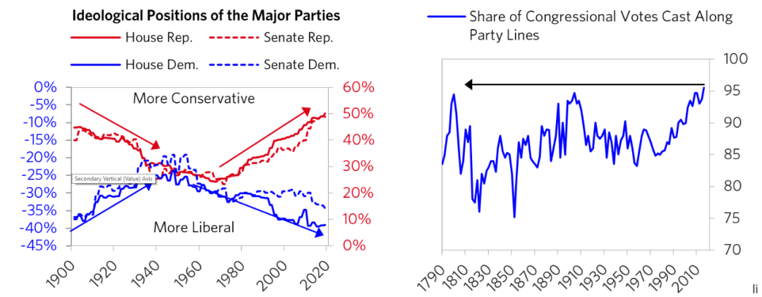 左边的图表显示了保守的共和党参议员和众议员以及自由的民主党参议员和众议员回到1900年。正如你所看到的,两党更加极端,他们比以往任何时候都更加分裂。
