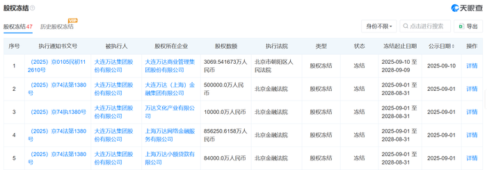此外,天眼查数据显示,大连万达集团还有共计有47条股权冻结信息,被冻结股权的标的企业涉及大连万达商业管理集团股份有限公司、大连万达(上海)金融集团有限公司、万达文化产业有限公司、大连万达集团商务服务有限公司等。
