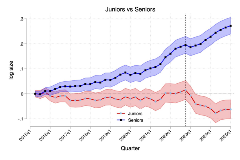 哈佛大学两位劳动经济学博士近期有一篇论文《生成式人工智能作为偏重资历的技术变革:来自美国简历和职位发布数据的证据》,分析了包括285,000家招聘公司,6200份简历和超过1.5亿次的招聘记录,揭示了AI对就业市场已经发生的冲击。