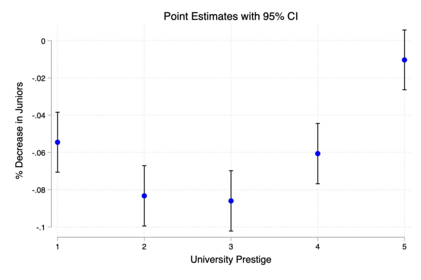 结论很明显,采纳AI技术,抑制了公司招聘初级职位的意愿,对高级职位目前没有明显影响。