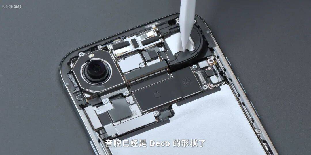 通过微机分的拆机视频我们可以看到,iPhone Air顶部的“高原”内部足足三分之一的空间被让渡给了扬声器:
