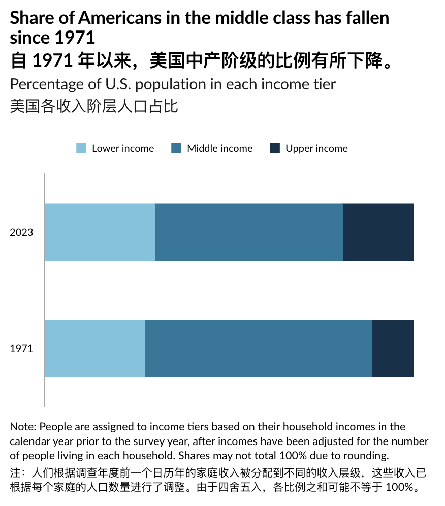 根据皮尤研究中心在2024年11月对政府数据的分析,美国中产阶级正在萎靡:1971年61%的美国人生活在中产阶级家庭中,而到了2023年,这一比例已降至51%。