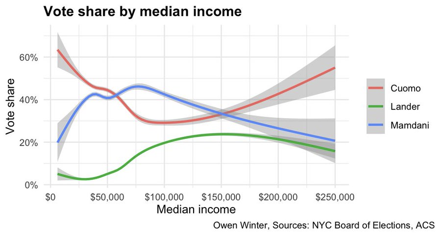 根据《经济学人》杂志政治数据记者Owen Winter的研究,这场史诗级的胜利正是因为佐赫兰·马姆达尼获得了中产阶级的绝对性支持(下图蓝线)。