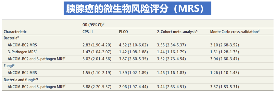 他们设计了一个算法,整合了27种细菌和真菌的综合指标,然后得出了一个“微生物风险评分(英文缩写MRS)”。结果显示,这个评分每增加一个标准差,胰腺癌的风险就会增加超过3倍!