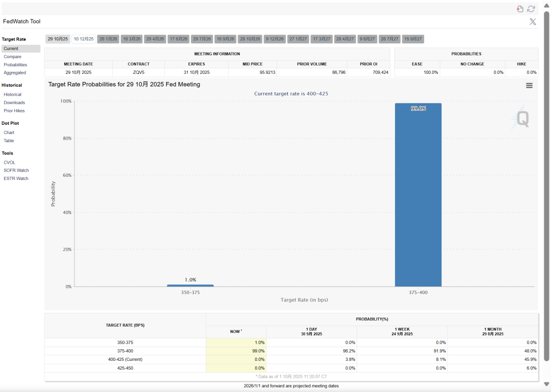 据CME“美联储观察”,目前美联储10月降息的概率已经升至100%,降息25个基点的概率为99%,而降息50基点的概率为1%。12月份再次降息的可能性为88%。两者都比政府停摆开始时更高。