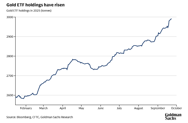 而经高盛研究,近期金价的上涨主要反映了“信念坚定”的个人买家正在加大采购力度。报告显示,9月份流入黄金ETF的资金量达到了109吨,而该行的模型基于利率走势预测的流入量仅为17吨。其中,投机性仓位在过去一个多月的涨幅中仅能解释约1个百分点,且在最近三周并未增加。