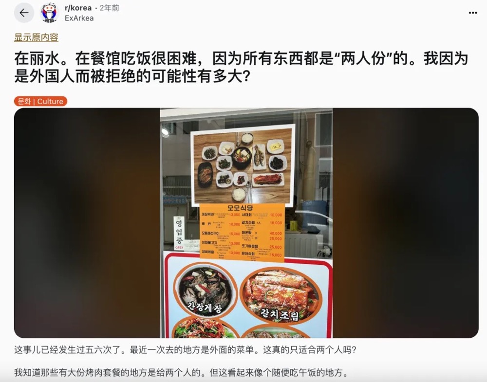 在韩国,有部分烤肉店、韩式餐厅看到顾客独自一人进门,会干脆拒绝,“恕不接待”。餐单上写着“两人份起售”的菜品比比皆是,“碍眼”的单人食客通常会被塞到边角位置。女性单身食客的处境更差,“女的胃口小”,店家会以消费低、占座久、影响翻台率等理由,拒绝为之提供服务。